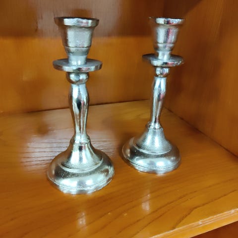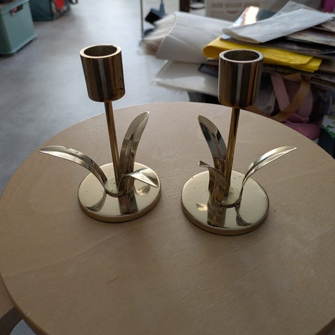 Pari kynttilänjalkoja, hyvässä siistissä kunnossa. Korkeudet 30 ja 25 cm. Sopiva pidike kruunu- tai antiikkikynttilälle. Parin hinta 10 e. Nouto Itiksen vierestä tai postikulut M-pakettina ostajalle. Nopea postittaja. Yhdistän paketit pyynnöstä. Katso muutkin ilmoitukseni, paljon retroa ja vintagea sekä muuton yhteydessä ylimääräiseksi jäänyttä erikoista tavaraa myynnissä.