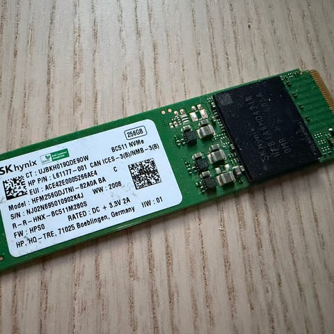Toshiban 512 GB NVMe M.2 2280 levy. Irroitettu toimivana koneesta. CrystalDisk kertoo kunnoksi 99% joten vielä runsaasti, luotettavia käyttövuosia edessä.