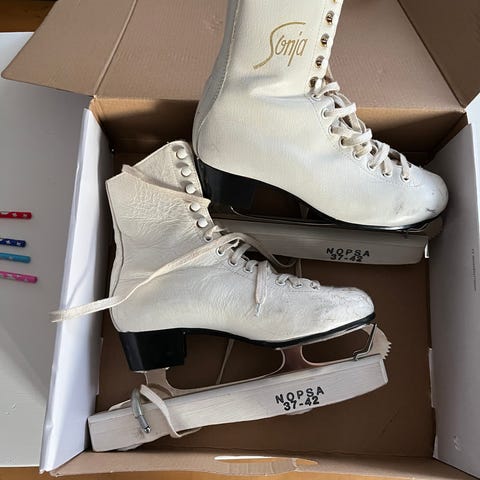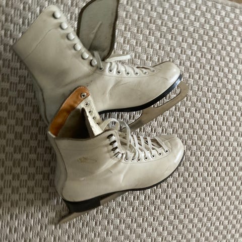 Naisten valkoiset taitoluistimet, koko 38. Perinteinen korkeavartinen malli, jossa nauhakiinnitys ja teräskiskot. Soveltuvat yleiseen luisteluun ja harrastetason taitoluisteluun. Koko vastaa arviolta naisten kengännumeroa 38.