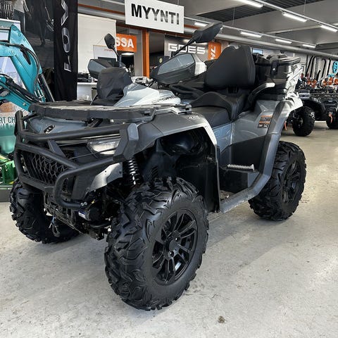 CFMOTO 850 Touring (Esittelylaite) Myydään liikkeen esittelylaite nyt poistohintaan! Takuu 3 vuotta ilman km rajaa. Moottori käynyt 2h. Uudistettu CFORCE 850 -traktorimönkijä etenee kaikenlaisissa maastoissa ja selviää loistavasti eri olosuhteissa. Moottorin, vaihteiston ja variaattoriratkaisun päivitykset parantavat laitteen ajettavuutta. Vakiovarusteisiin kuuluva ohjaustehostin tarjoaa kolme erilaista EPS-tilaa, joiden avulla ohjaustuntumaa voidaan säätää ajotilanteen ja alustan mukaan. Uudistettu jousitus parantaa ajomukavuutta erityisesti vaativassa maastossa. Mönkijän V-Twin moottori on täysin uusittu ja tuottaa nyt 71 hv – 17% enemmän voimaa kuin edellisessä mallissa! Muita parannuksia ovat vahvemmat sylinterinkannet, suuremmat imu- ja pakoventtiilit sekä nokka-akselit, jotka on kalibroitu maksimaalista suorituskykyä varten. Turvallisuutta on parannettu jarrutusjärjestelmän tehostuksella. Vakiovarusteisiin kuuluva elektroninen takatasauspyörästön lukko helpottaa ajoa herkillä alustoilla. • Tehokas 800 cc:n moottori • 52,5 kW/71 hv • Säädettävä ohjaustehostin, 3 EPS-tilaa • EFI-polttoainejärjestelmä • CV Tech -variaattori • Elektroninen tasauspyörästön lukko • Integroidut lokasuojien levikkeet • 295 mm maavara • Uusi mittaristo 7″ näytöllä • Korkealaatuiset LED-ajovalot edessä ja takana • E-tyyppihyväksytty vinssi, vetokuula ja peräkärryn pistoke • Pitkä malli, joka voidaan rekisteröidä kahdelle • 3 vuoden takuu ilman tunti- tai kilometrirajaa • Tarvittava ajokortti A121