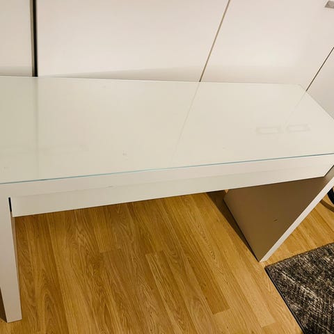 Pöydässä on käytön jälkeä, muun muassa tahroja kulmaväristä ja kulumista. Kts. kuvat. Yleisilme on siitä huolimatta siisti. Pöydässä ei ole lasilevyä. Pöydän saa siistimmäksi laittamalla pintaan esim DC-Fixiä.