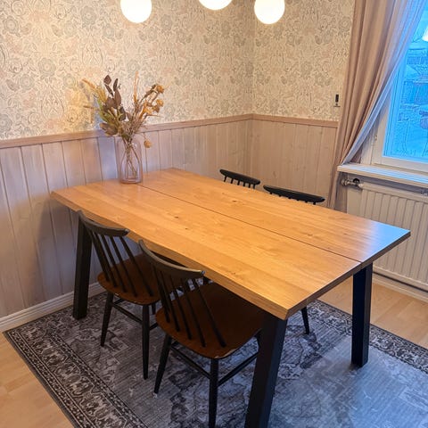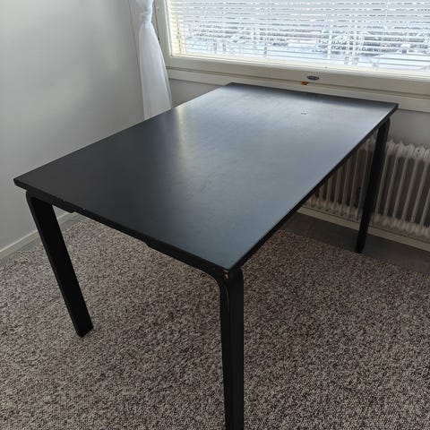 Neljän hengen ruokapöytä. Uutena ostettu. Pari kolhua pöytälevyssä (kts.kuvat), maali vähän kulunut pöydän jaloista. Kuitenkin tukeva ja ehjä.