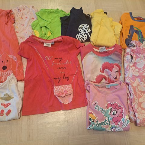 7 kpl paitoja ja 2 legginsit.Kahdella paljon pidettyjä.Ehjiä pääosin,on tahraa ja yksien legginsien takasauma vähän irvistää(ei ole reiäksi laajentunut kuitenkaan).Tahroihin en ole tahranpoistoaineita kokeillut eli ei tietoa lähteekö pois vai ei.Menevät vielä vaikka rymy/päiväkotikäyttöön.Hinta kaikille.
