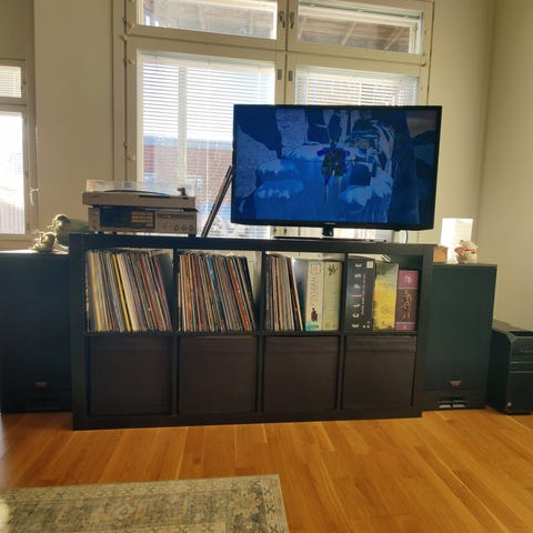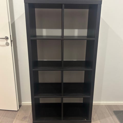 Ikean kallax hylly. Yhdessä lokerossa vetolaatikot. Kahdessa lokerossa pienet reiät, koska niissä ollut aiemmin myös vetolaatikot kiinnitettynä (näkyy kuvassa). Halutessa saa mustat hyllyyn kuuluvat laatikot mukaan ja mahdollisesti myös kaksi valkoista laatikkoa (valkoisissa hieman tahroja).