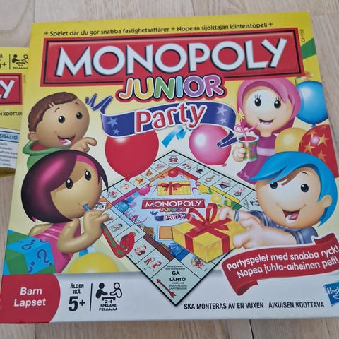 Hasbro Monopoly Junior Party lautapeli lapsille. Lasten versio klassisesta Monopoly-pelistä, suunniteltu noin 5-vuotiaista alkaen. Pelissä on värikäs pelilauta, pelinappulat ja pelirahat, jotka on mukautettu nuoremmille pelaajille.