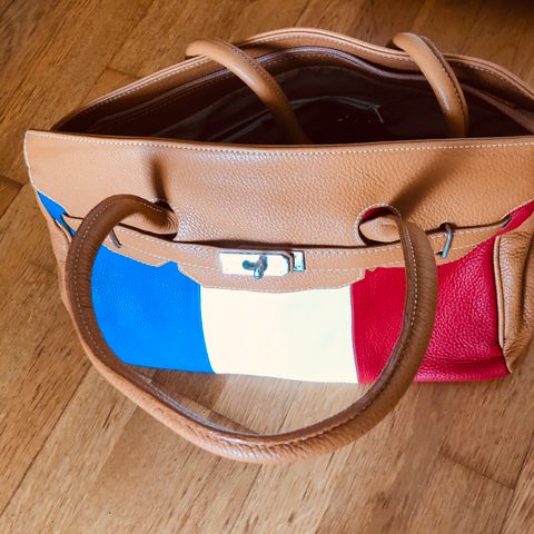 Kädessä tai olalla kannettava. Kaksi vetoketjullista sisätaskua. Matriaali tukeva, aito kiiltonahka. Väri lämmin beige.