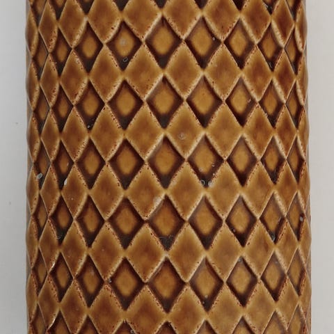 Arabia Harlekiini, Kaarina Aho, valmistettu 1959-65. Koriste-esine, ruskea keraaminen maljakko. Pinta on kohokuvioitu timanttimaisella kuviolla kauttaaltaan. Muoto on soikea ja yläreuna hieman epäsymmetrinen. Lasitus on kiiltävä ja sävy vaihtelee ruskean eri tummuusasteissa. Sopii esimerkiksi pienenä maljakkona tai sisustusesineenä. Pieni lähes huomaamaton lohkeama ( näkyy viimeisessä kuvassa). Korkeus 16cm, suuaukon halkaisija 6,5-10,5cm