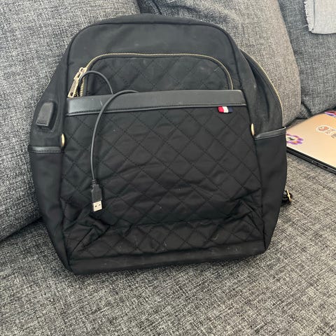 Pieni etutasku, jossa on viallinen vetoketju.