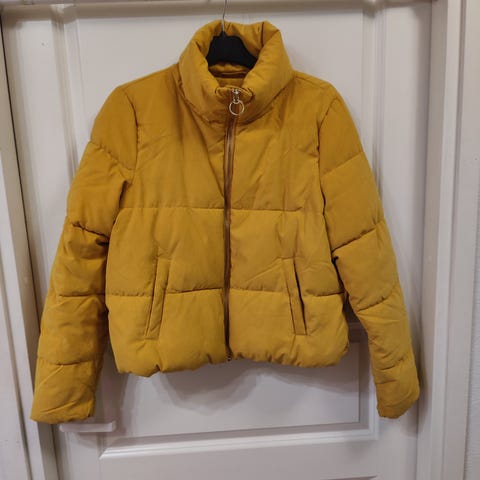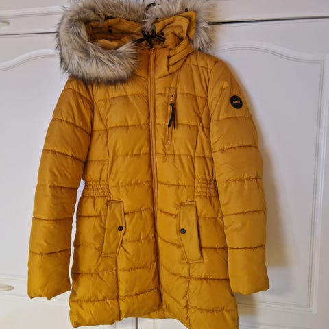 ONLY naisten talvitakki, koko M. Väri keltainen. Materiaali polyesteri. Takissa on hupullinen malli, jossa on tekoturkisreunus. Edessä on vetoketju ja painonappikiinnitys sekä etutaskut. Vyötäröllä on kiristysnyöri, joka muotoilee takkia. Sopii talvikäyttöön arkeen ja ulkoiluun.