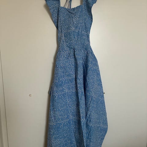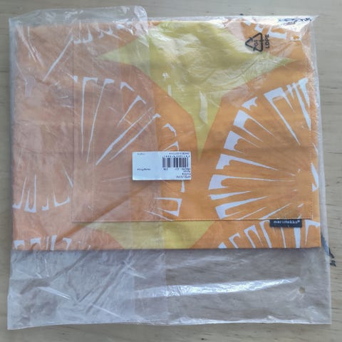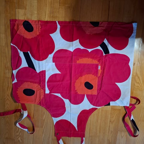 Kivan värinen Marimekon essu. Takana pieni haalea tahra (kuvassa).