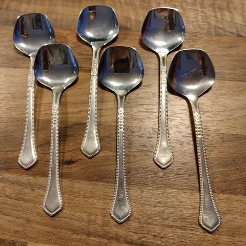 Lusikat ovat hyvässä kunnossa, mutta niissä on havaittavissa pientä patinaa ja kulumaa käytön jäljiltä.