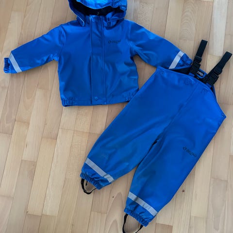 Hyväkuntoinen ehjä ja siisti vuorellinen kura-asu. Merkki ciraf. Housut kokoa 92cm ja takki 98cm. Jalkalenksut ei ole alkuperäiset, mutta ovat vaihdettavissa (napit)