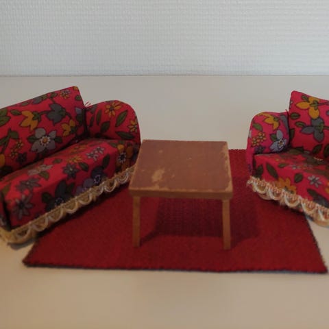 Uudelleen verhoillut kustavilais-tyylinen sohvakalusto nukkekotiin.