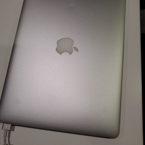 Apple kannettava tietokone hopea. Metallirunkoinen, hopeanvärinen läppäri, jossa on näppäimistö taustavalaistuksella ja suuri kosketuslevy.