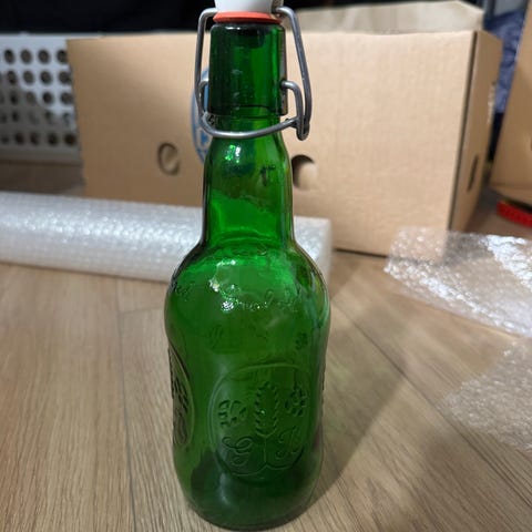 Vanha maitopullo. Korkeus 23cm. Nouto.