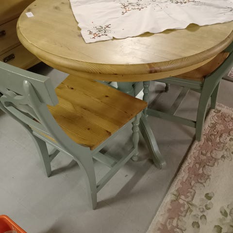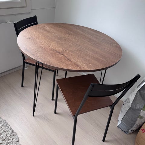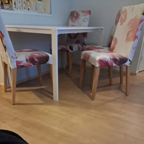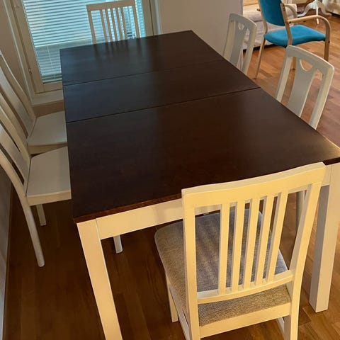 Ruokapöytä ja 6 tuolia, tuoleissa pehmustetut irrotettavat päälliset. Pöydässä ja tuoleissa jonkun verran käytön jälkiä. Pöydän jalat lähtee irti kuljetuksen helpottamiseksi.