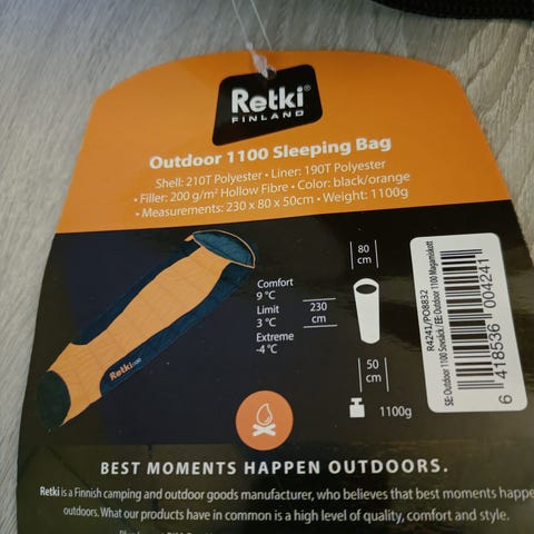 Kolmen vuodenajan synteettinen makuupussi. Lämmitetyssä kamiinateltassa pärjännyt hyvin myös talvella. Pituus 180 cm. Käytönjälkiä on nähtävissä kuvista. Maalitahroja ei ole koitettu poistaa.