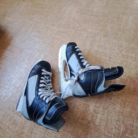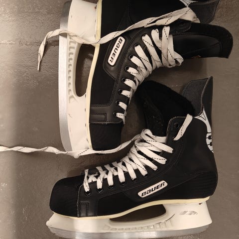 Bauer jääkiekkoluistimet, koko 45. Mustat luistimet nauhakiinnityksellä ja valkoisella teräkiskolla. Soveltuvat jääkiekkoon ja yleiseen luisteluun. Koko ilmoitettu EU-kokona 45.