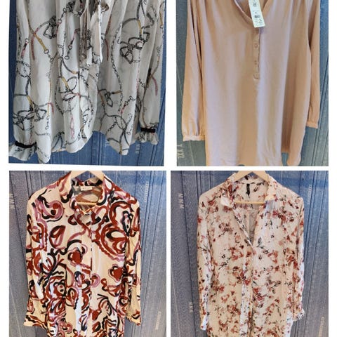 Monipuolinen vaatepaketti housua, tunikaa, mekkoa, oranssi pellavamekko, juhlapuseroo