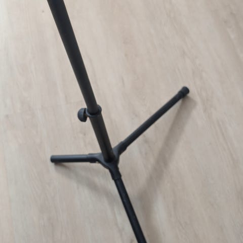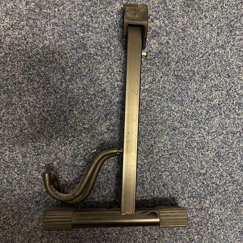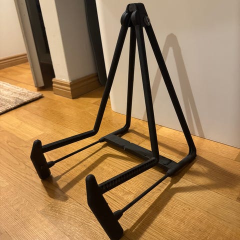 Musta kitarateline sähkökitaralle tai akustiselle kitaralle. Telineessä on kolmijalkainen jalusta ja alaosa, johon kitaran runko nojaa. Yläosassa on kaulan tuki, joka auttaa pitämään soittimen paikallaan pystyasennossa. Soveltuu kitaran säilytykseen ja esillepanoon kotona tai harjoitustilassa.