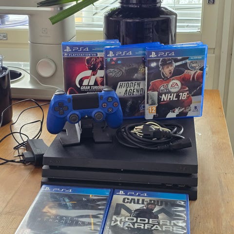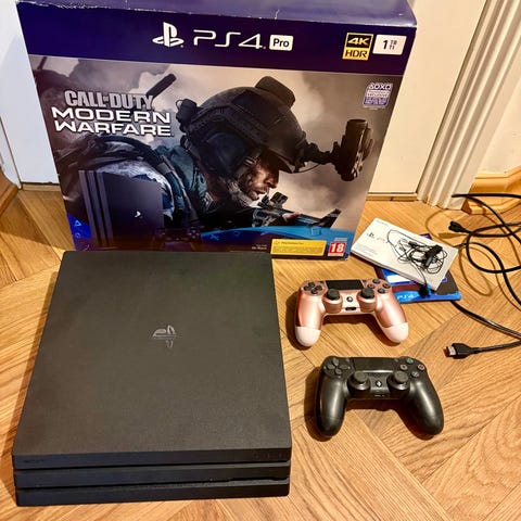Sony PlayStation 4 Pro pelikonsoli musta, kaks Playstationin ohjainta musta ja punainen. Mukaan HDMI kaapeli.
