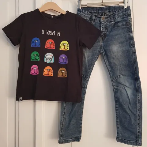 Setissä hyväkuntoisia tuotteita. Molo 98 futisteemainen huppari vetoketjulla, name it uusi ja käyttömätön 110 cm pitkähihainen paita, Lindex 110 (eniten käytetty) pitkähihainen ja Denim 98 vähäiselle käytölle jäänyt farkkurotsi