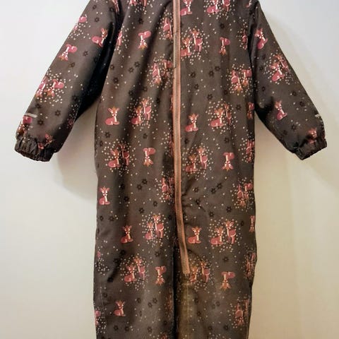 Ehjä ja siisti, lämmin ja vedenpitävä talvihaalari. Toinen jalkalenksu ja nappi puuttuu, mutta helppo korjata.