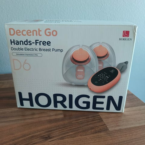 Horigen langaton rintapumppu. Voidaan asentaa liivien sisään. Mielestäni todella helppo ja vaivaton käyttää. Erittäin siisti kunto, ehkä hieman maidosta tyypillistä "sumentumaa" pullossa. Kaikki alkuperäiset osat mukana.