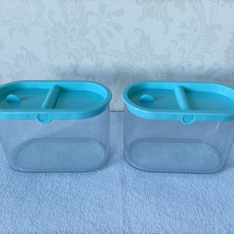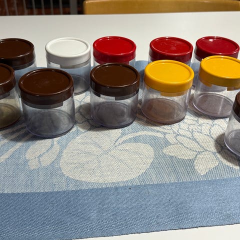 Vanhat astiat, normaalia kulumaa (naarmuja), lisäksi yhdestä purkista lohjennut pieni pala (kuva) ja kahdessa kannessa muovissa jälkiä (kuva).