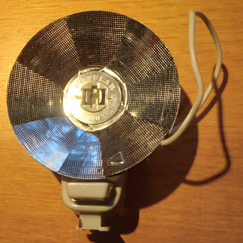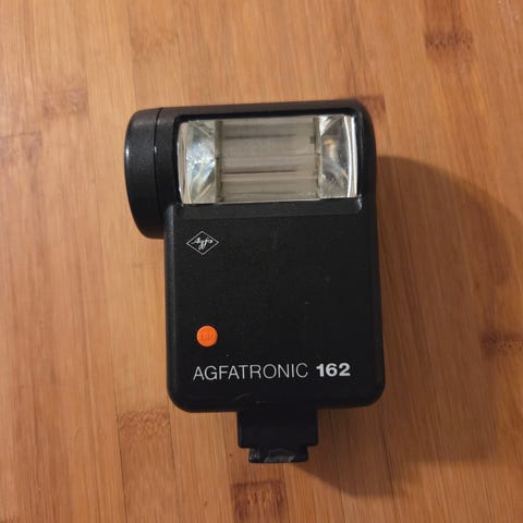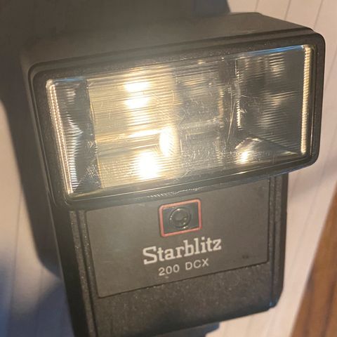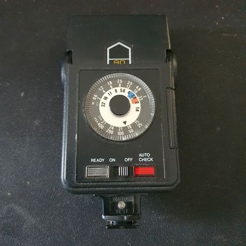 Shoe-mounted flash for any manual system, released by Starblitz. This model was sold by other companies, like Chinon, as well. Has three strengths, a 90º tilting head, and a PC sync port.