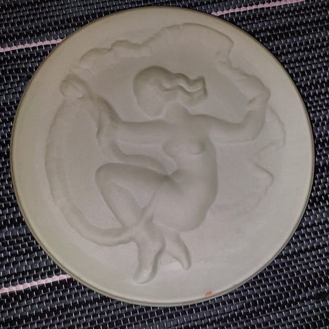 Kupittaan Saven vihreä, keraaminen Keinumorsian seinälautanen. Lautanen on pyöreä ja sen taustapuolella on ripustuslanka seinäkiinnitystä varten.