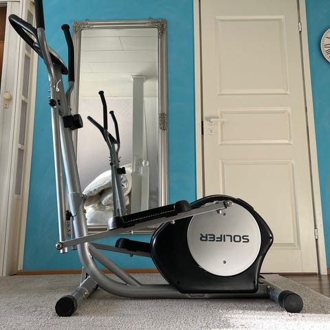 Crosstrainer kotikäyttöön. Laitteessa on harmaa runko ja musta kotelo, jossa poljinvarret ja leveät, kuvioidut jalkatasot. Vastusta voi säätää rungossa olevasta säätönupista. Käsikahvoissa on integroidut sykeanturit ja keskellä teline mittarille tai pienelle näytölle. Sopii koko kehon harjoitteluun ja peruskunnon ylläpitoon sisätiloissa. Näyttöpuuttu mutta toimii ilman sitäkin.