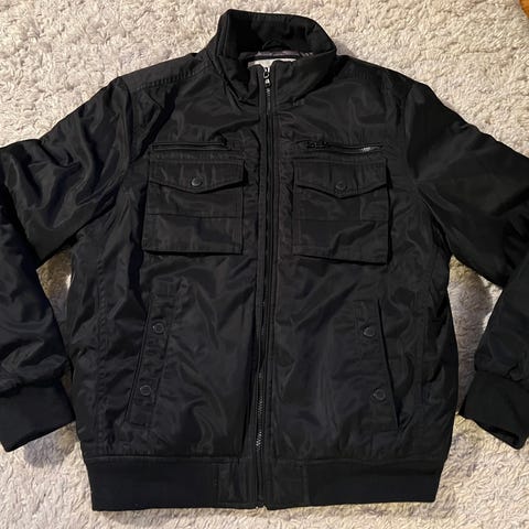 Bodyguard miesten toppatakki koossa L. Musta/tummansininen, paksusti topattu malli, jossa korkea kaulus ja painonapillinen etulista vetoketjun päällä. Takissa vaakasuuntaiset tikkaukset, sivusaumoissa taskut ja kaksi povitaskua. Mitat: har-har 50 cm, kai-kai 62 cm, niska-helma 75 cm, hiha 70 cm.