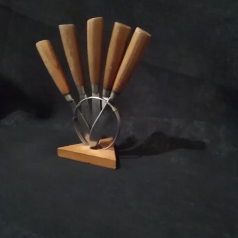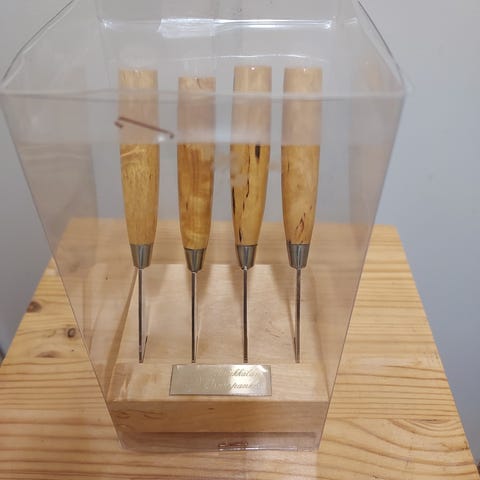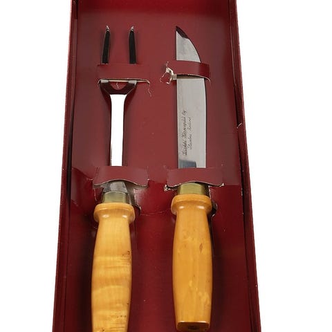 Myydään ehkä kerran käytetty peijaissetti, johon kuuluu veitsi ja haarukka. Mukana musta nahkakotelo.