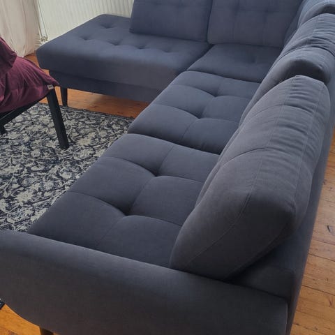 Hyväkuntoinen kulmasohva, uuden, erivärisen tieltä pois.