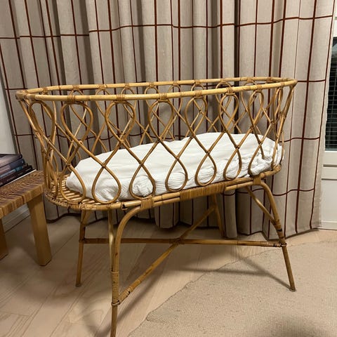 Vauvan ensisängyksi suloinen rottinkinen kehto ja patja. Meillä toimi rottinkisänky hyvin, sillä sängyn päätyä saa korotettua hieman tarvittaessa, kun laittaa leveät kirjat sängyn jalkojen alle.