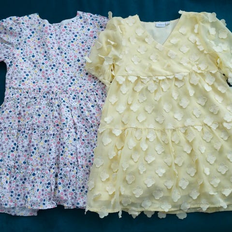 Yhden lapsen käyttämä siisti ja ehjä POP:n kellomekko koossa 116. Erityisen leveä hameosa, joka näyttää hienolta pyöriessä. Nappilista takana.