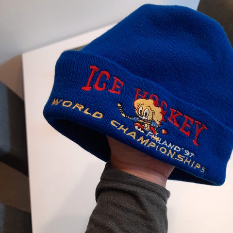 Kärpät jääkiekkopaita ja pipo keltamustia sekä jääkiekko