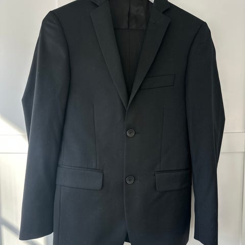 Dressmanin musta slimfit-mallinen puku: takki, housut ja valkoinen kauluspaita. Takki ja housut 45%villaa. Takin koko 48, housut 30/32, kauluspaita M (slimfit-mallinen)