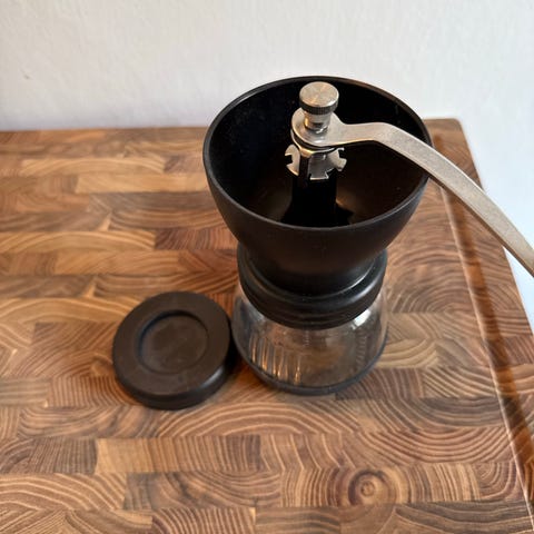 Hario Canister -mallinen käsikäyttöinen kahvimylly. Jauhatuskarkeutta voi säätää, ja ilmatiiviissä lasisäiliössä voi säilyttää valmista kahvia.