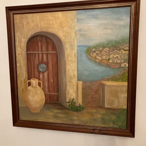 Kehystetty maisemataulu, jossa on esitetty järvimaisema, rantamökki ja vene. Teos on öljyvärimaalaus tai vastaava maalaus kankaalle tai levylle, ja siinä on taiteilijan signeeraus alareunassa. Taulussa on kultasävyinen kehys. Sopii sisustuselementiksi esimerkiksi olohuoneeseen, mökille tai muuhun tilaan, jossa halutaan perinteistä suomalaisvaikutteista järvimaisemaa kuvaava taulu seinälle.
