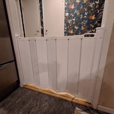 Hyväkuntoinen BabyDan Flex XL valkoinen turvaportti, metallia. Mukana extrapaloja (kuvasta puuttuu 3 kpl 74 cm paloja.) Soveltuu käytettäväksi esimerkiksi tilanjakajana, leikkikehänä tai takan ja portaiden suojaamiseen. Portissa on useita paneeleita, jotka on helppo kasata mielensä mukaan ja molempiin suuntiin avautuva käyntiovi, joka helpottaa kulkemista.