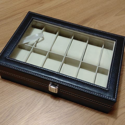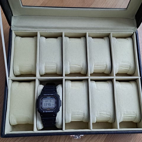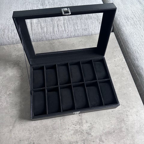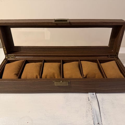 Hyvässä kunnossa oleva suojaboxi 8 kellolle. Kansi vaahtomuovilla päällystetty.