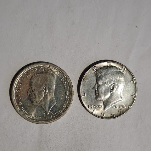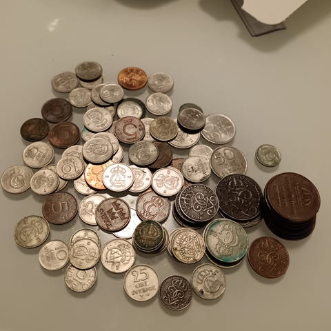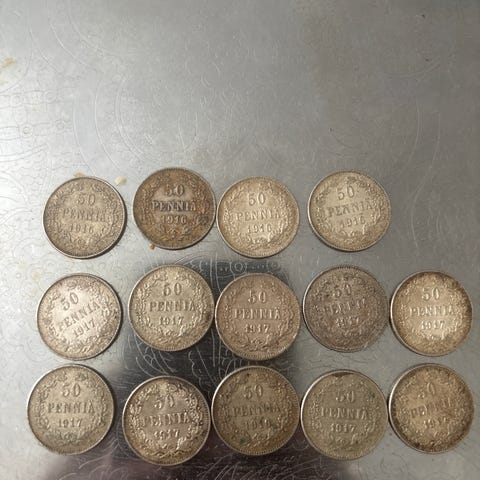 Ensimmäisen kuvan vanhat hopeakolikot ovat 600/1000 hopeaa ja toisen kuvan hieman uudemmat ovat 400/1000 (40%) hopeaa, myyn pakettina