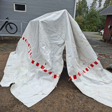 Siirrettävä taukotupa, ylhäällä nosto pisteet , jalakset ja vetoaisa esim.moottorikelkkalle.sähköt sisälle
