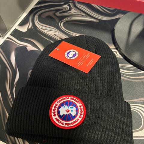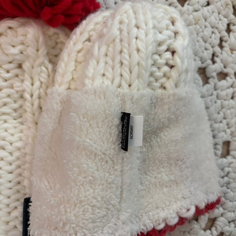 Kaksi käyttämätöntä pipoa, violetti ja beige.