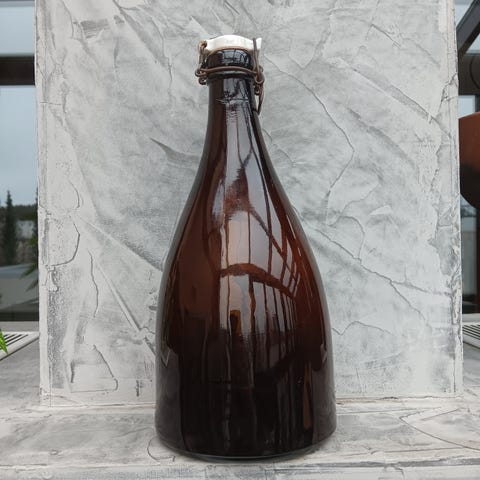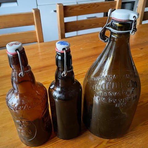 Vaarinkaljapullo 2 litraai patenttikorkilla posliinia. Kohokuvioteksti pullossa lukee: Mietoa mallasjuomaa Vaarinkaljaa Verovapaa Oy Pyynikki 1854.