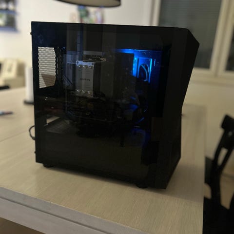 pöytäkone, jossa on erillinen näytönohjain, prosessorijäähdytin ja useita muistimoduuleja. Kotelo on musta ja siinä on etupaneelissa harjattu pinta. Sisällä on erillinen virtalähde ja Asus-näytönohjain. Näytöistä näkyy, että koneessa on AMD Ryzen 7 3700X -suoritin, 8 ydintä ja 16 säiettä, sekä 16 Gt RAM-muistia (2×8 Gt DDR4). Näytönohjaimena on AMD Radeon 9060XT 8GB takuu jäljellä