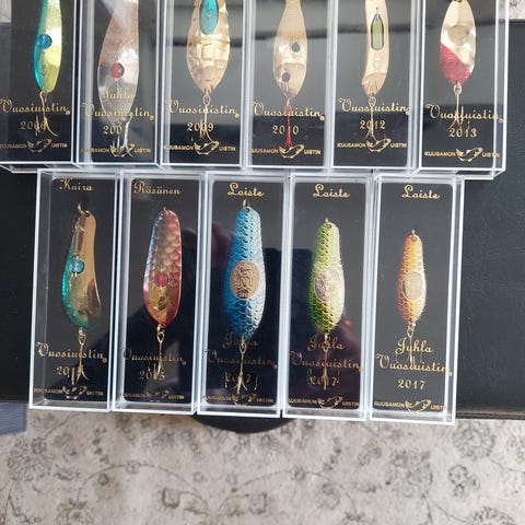 Petri muuttorannan tekemät kalan/käärmeen nahkasta valmistetut taulut