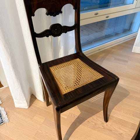 Ruskeat ruokapöydän tuolit (4 kpl). Tuoleissa on korkea selkänoja ja punottu rottinkipinta. Jalat ovat puuta ja väriltään ruskeat. Sopivat esimerkiksi ruokapöydän ympärille tai oleskelutilaan istuimiksi.